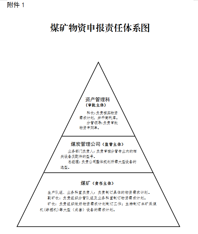 1.煤炭管理公司各業(yè)務(wù)部門負(fù)責(zé)人:負(fù)責(zé)審核分管專業(yè)內(nèi)的相關(guān)設(shè)備及配件的型號是否滿足需要。其中,生產(chǎn)方面的物資由生產(chǎn)部負(fù)責(zé)審核;安全方面的物資由安全部負(fù)責(zé)審核;地測、防治水、通風(fēng)等方面的物資由總工辦負(fù)責(zé)審核;機(jī)電與運(yùn)輸方面的物資由機(jī)運(yùn)部負(fù)責(zé)審核。